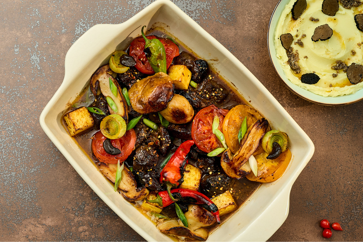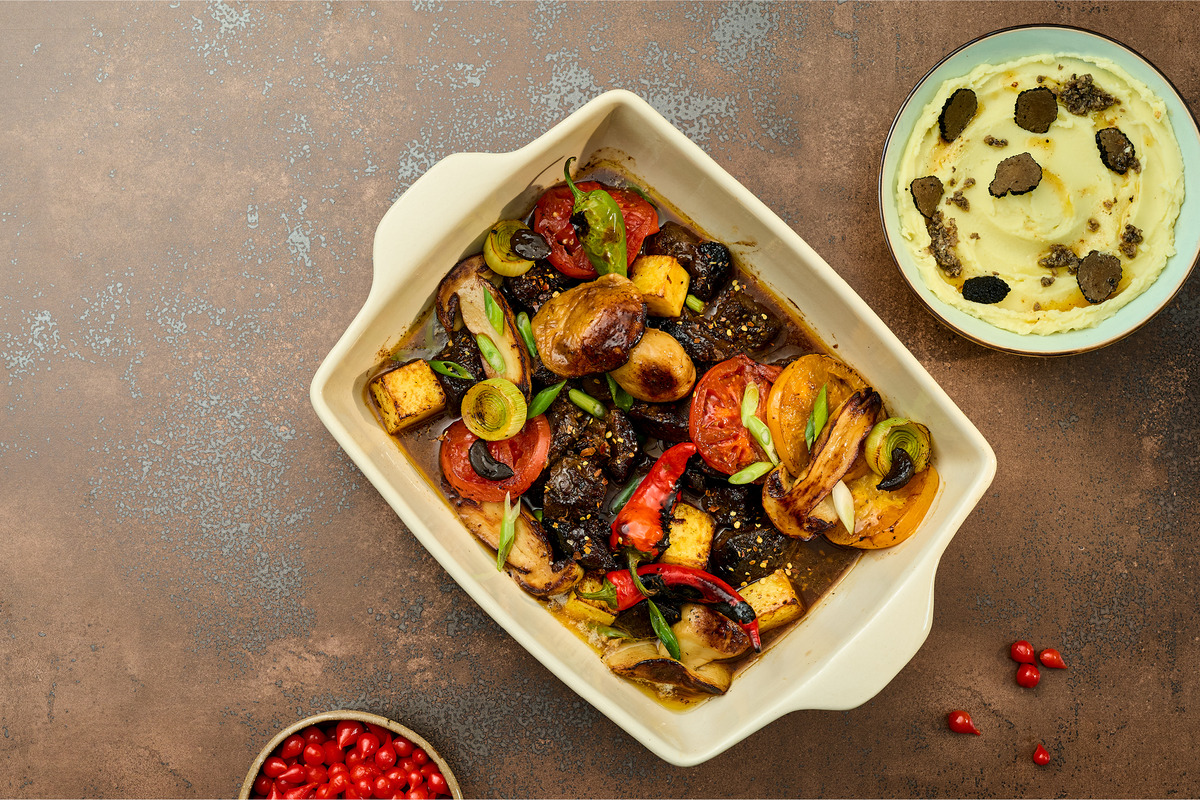 Ragoût podawaj w naczyniu do zapiekania – inspirując się naszą propozycją – albo w serwisie talerzowym. Udekoruj mikroliśćmi. W osobnych naczyniach serwuj purée i papryczki.