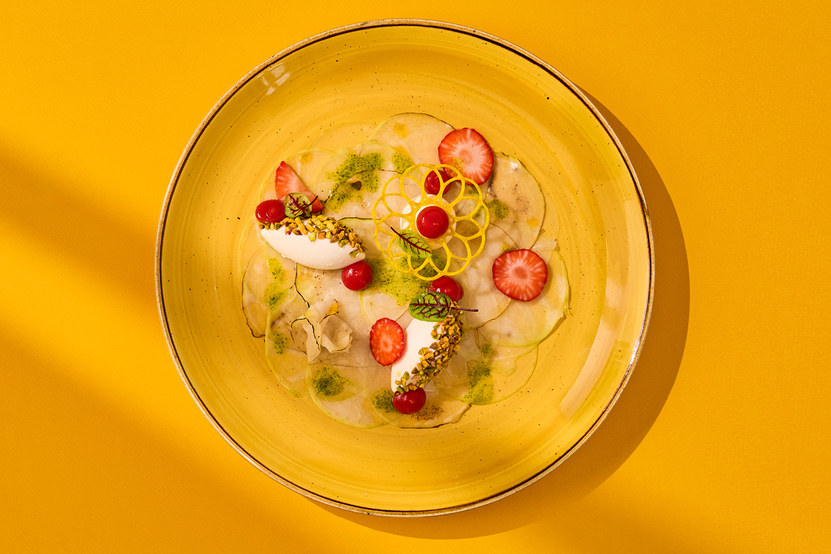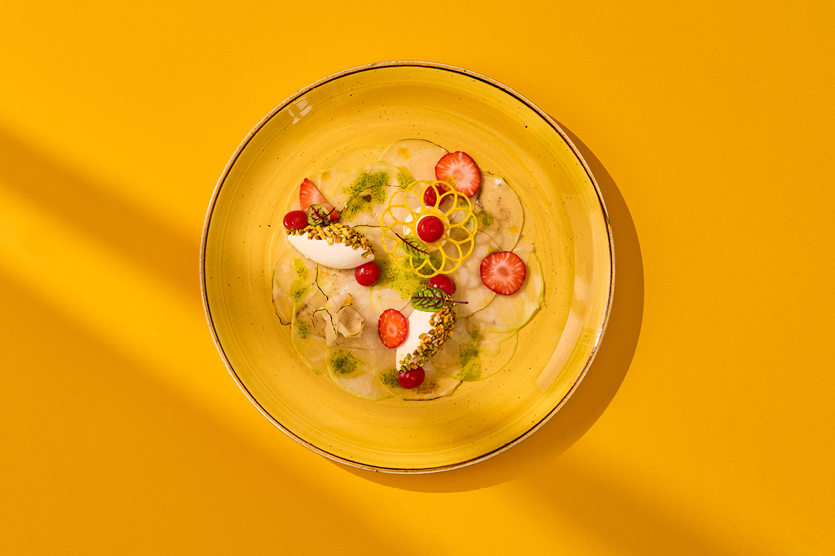 Krążki kalarepy ułóż na talerzu na zakładkę, panna cottę posyp kruszonymi pistacjami, wyporcjuj żel, olej i dressing, inspirując się naszym platingiem albo zaaranżuj całość według własnej koncepcji. Udekoruj oliwą chili, truskawkami i mikroliśćmi, posyp płatkami soli.