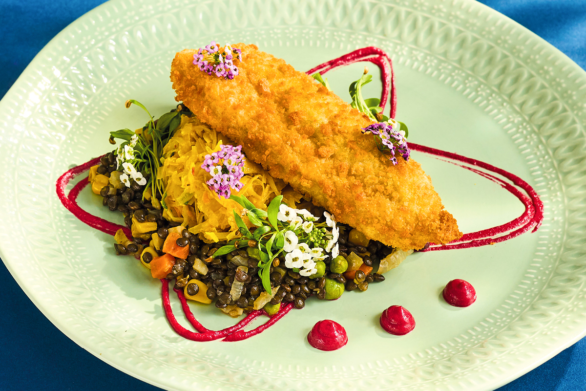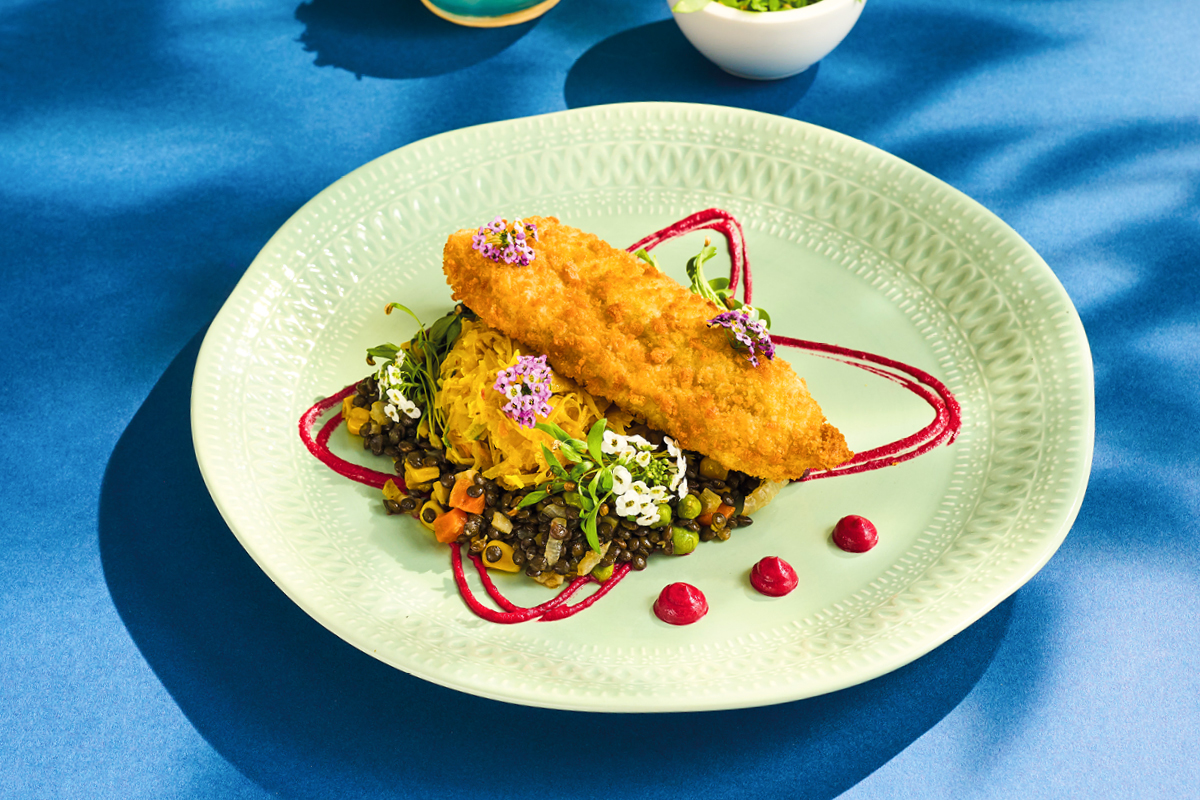 DORSZ CZARNY NA CZARNEJ SOCZEWICY Z WARZYWAMI I KISZONĄ KAPUSTĄ CURRY