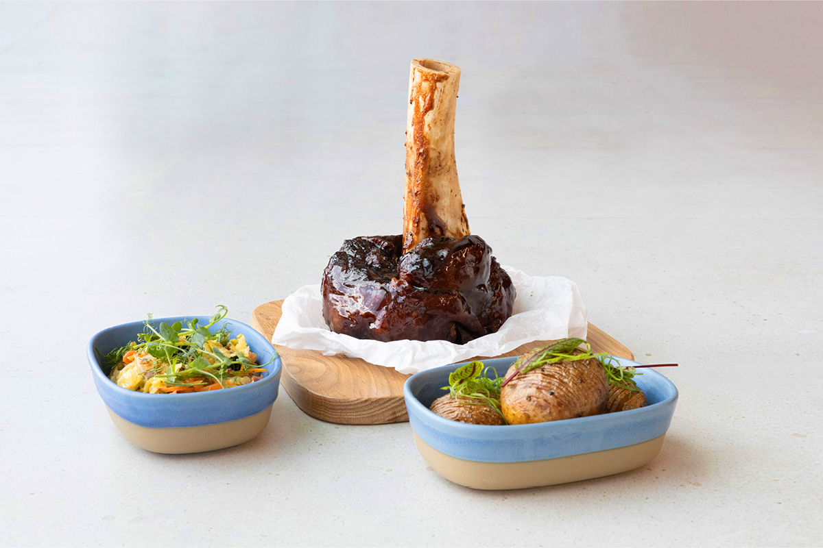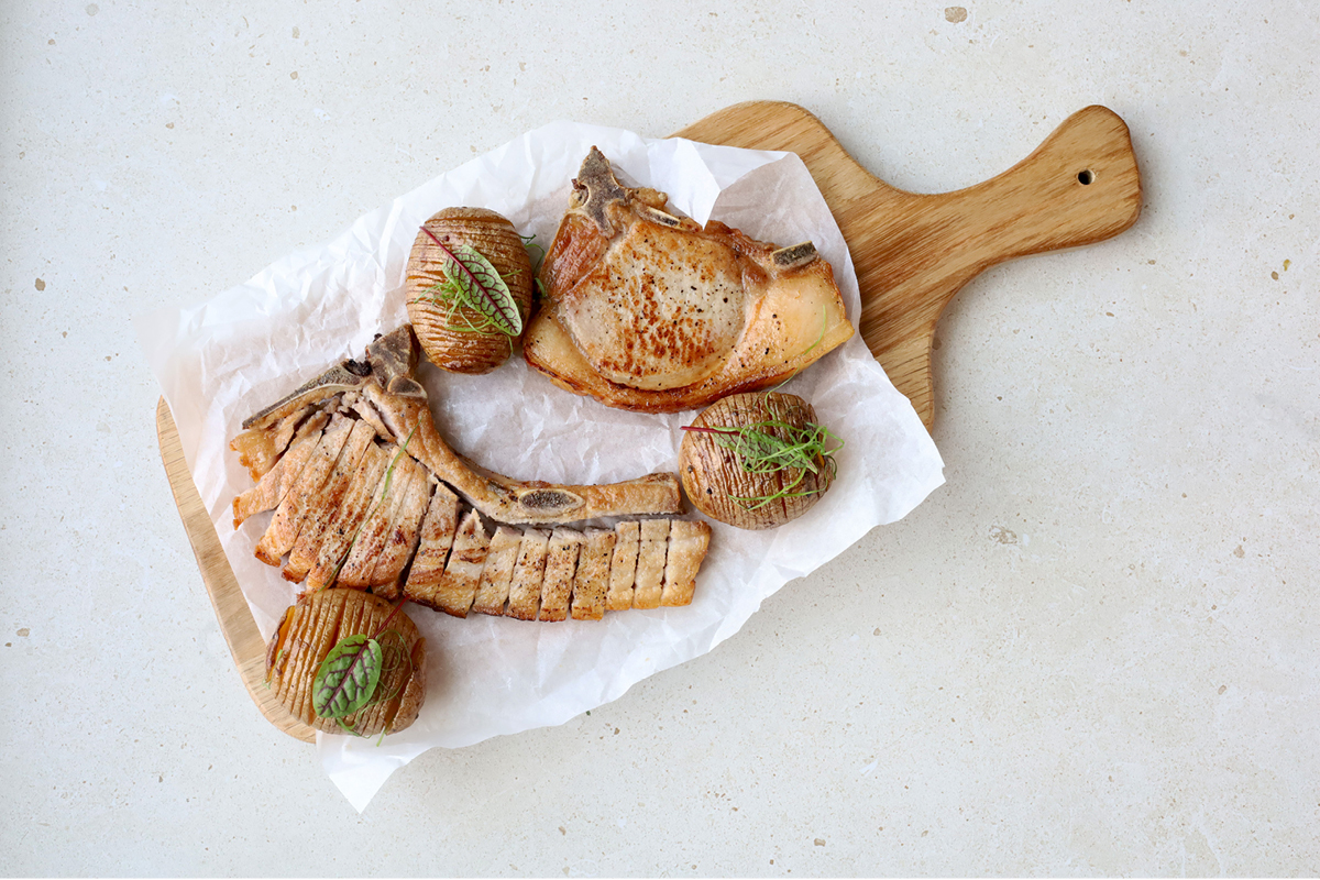 DUROC BACON STEAK, HAMMER, KAPUSTA Z BOCZKIEM I ZIEMNIAKI HASSELBACK