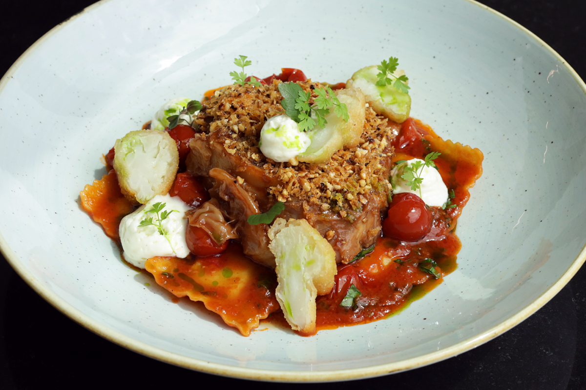 GICZ JAGNIĘCA Z QUADRONI, PARMEZANOWĄ PIANĄ I PANIEROWANYM KALAFIOREM