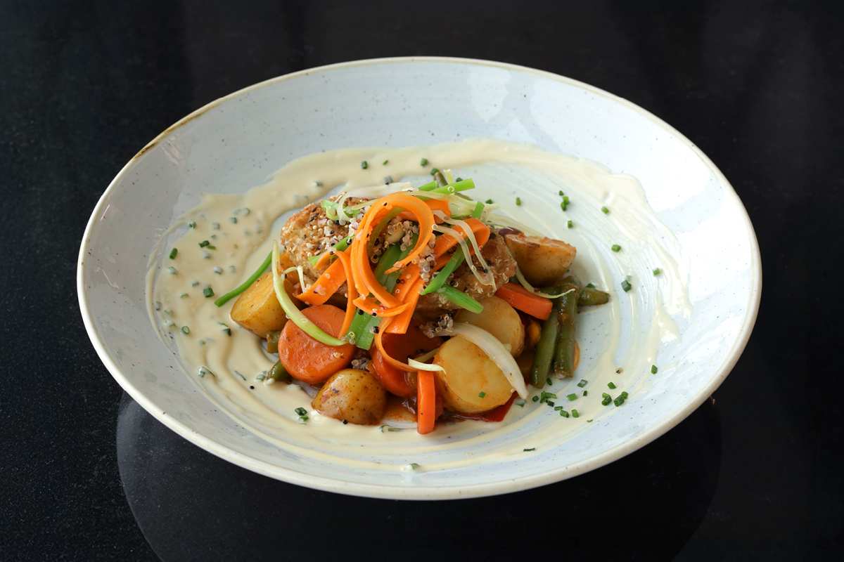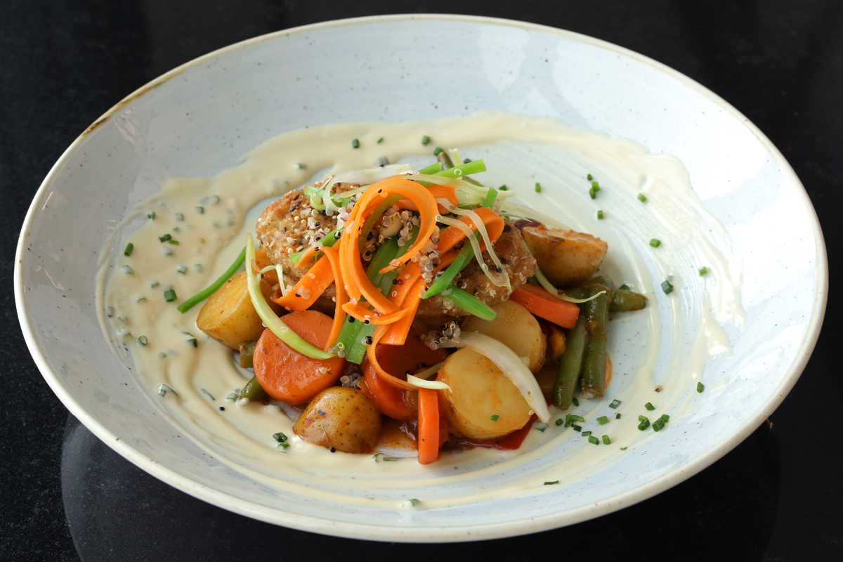 Ułóż danie na talerzu według własnej konwencji lub zainspiruj się naszym platingiem. Sałatkę na ciepło podawaj z kotletem. Dodaj sos serowy ze szczypiorkiem i garnisz z chrupiących warzyw oraz komosy ryżowej.