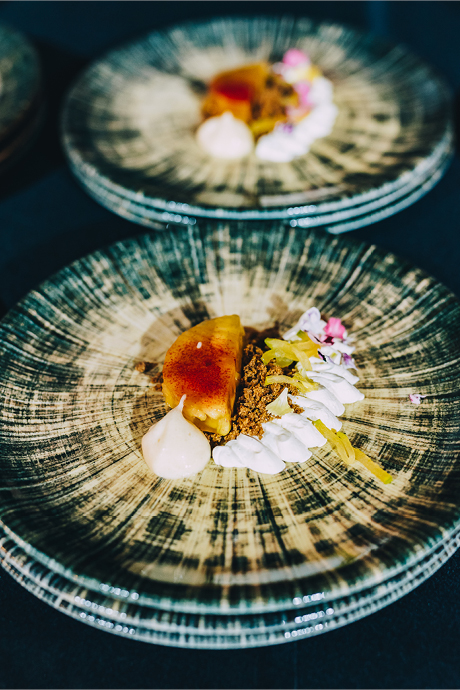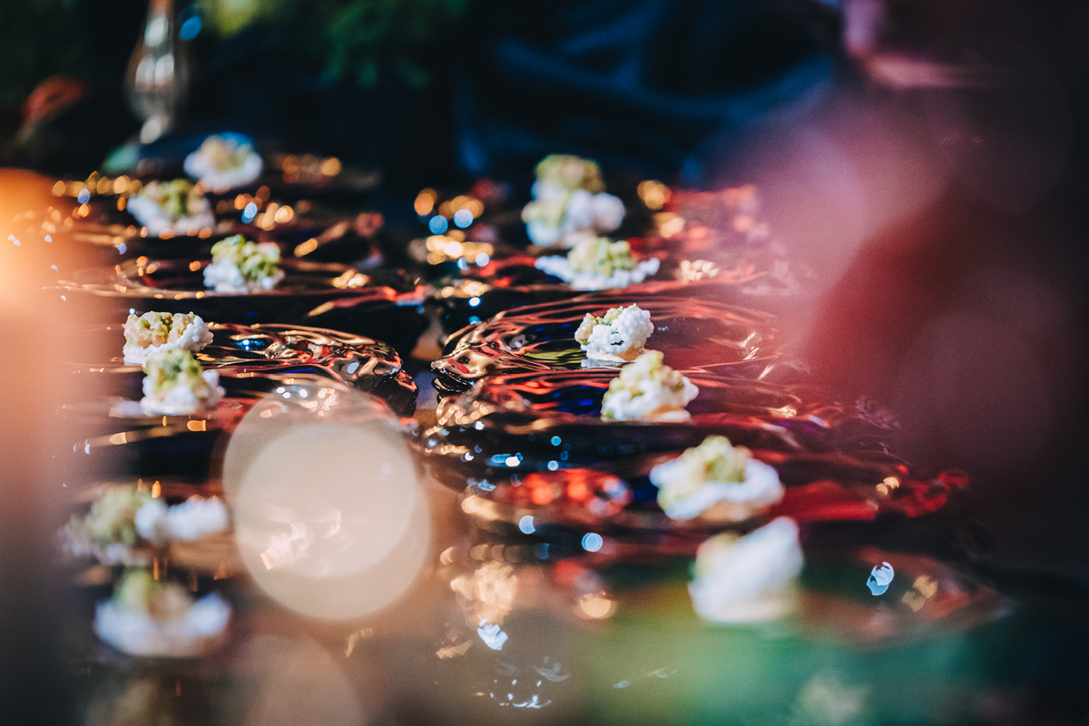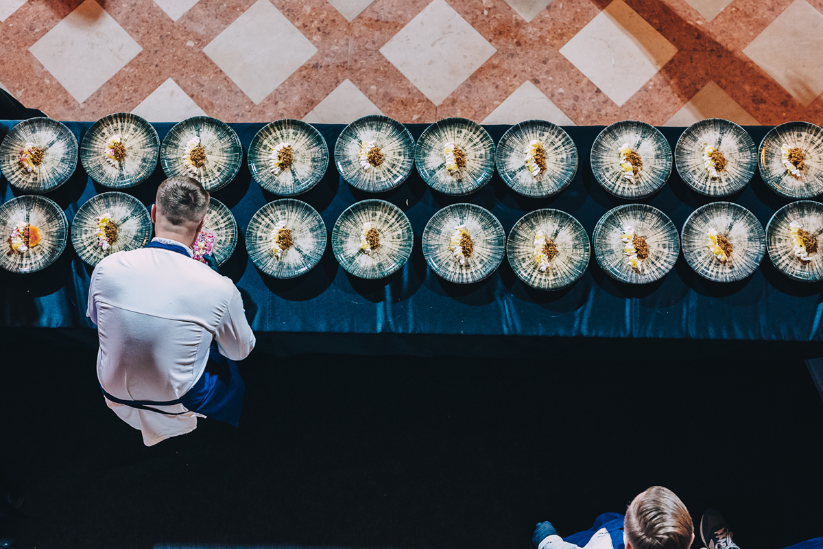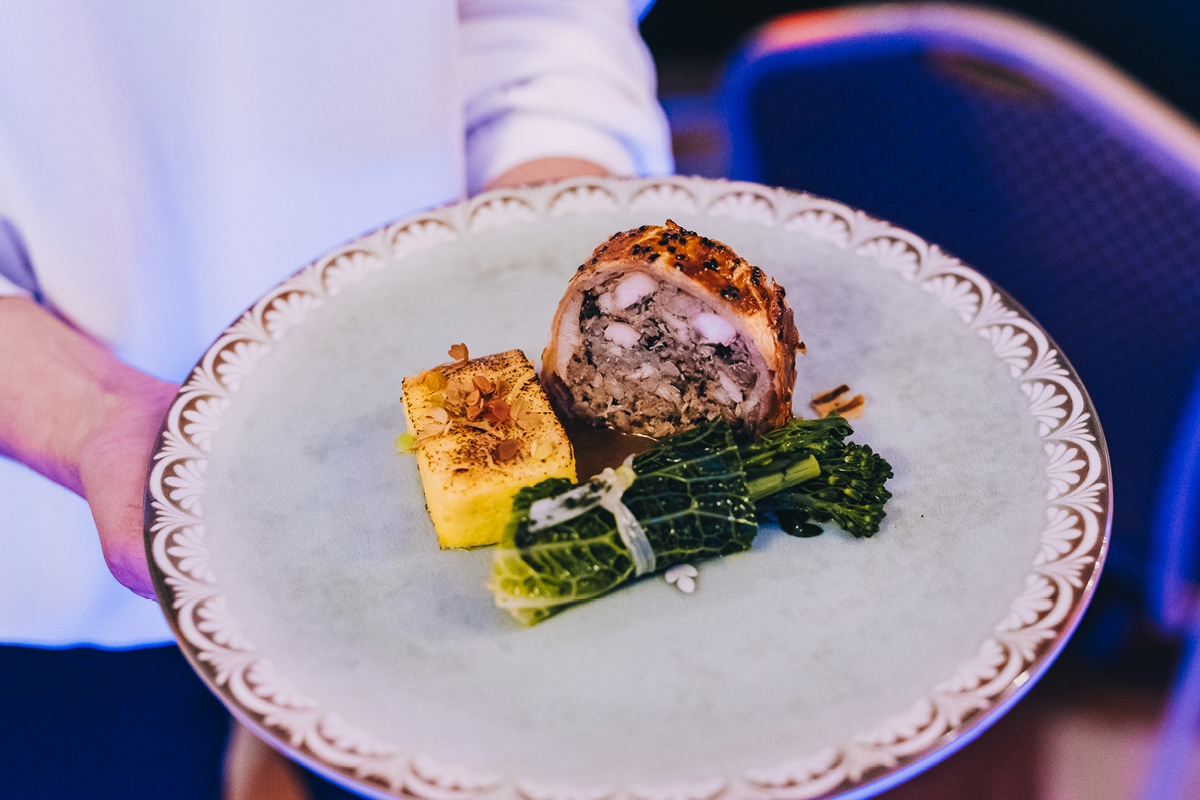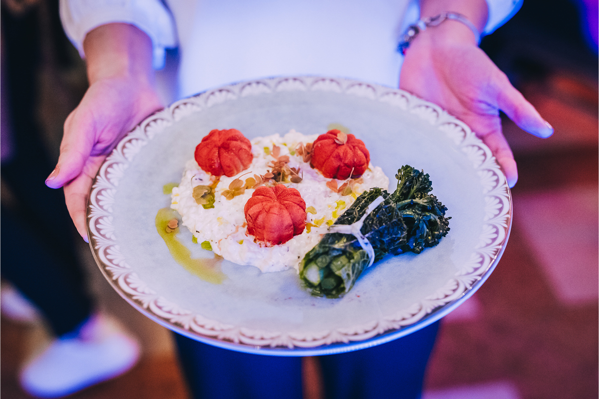 Wieczór pełen był atrakcji – uczestnicy mogli podziwiać live cooking, a każde danie było idealnie dopasowane do win z winnicy Majątek Drzewce w ramach profesjonalnego wine pairingu. Atmosferę uzupełniała muzyka na żywo zespołu Blue Transfer.