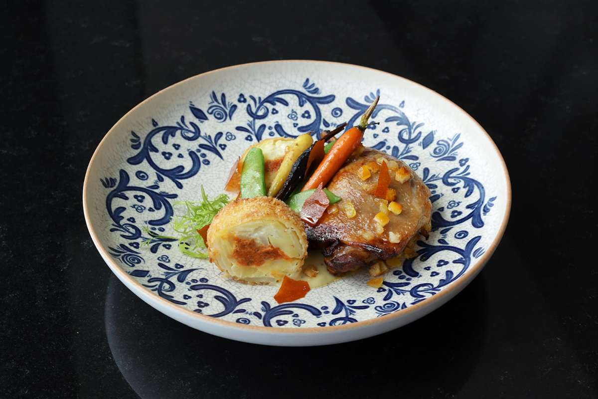 Wolnogotowana noga z kaczki zapiekana z kandyzowaną skórką pomarańczy