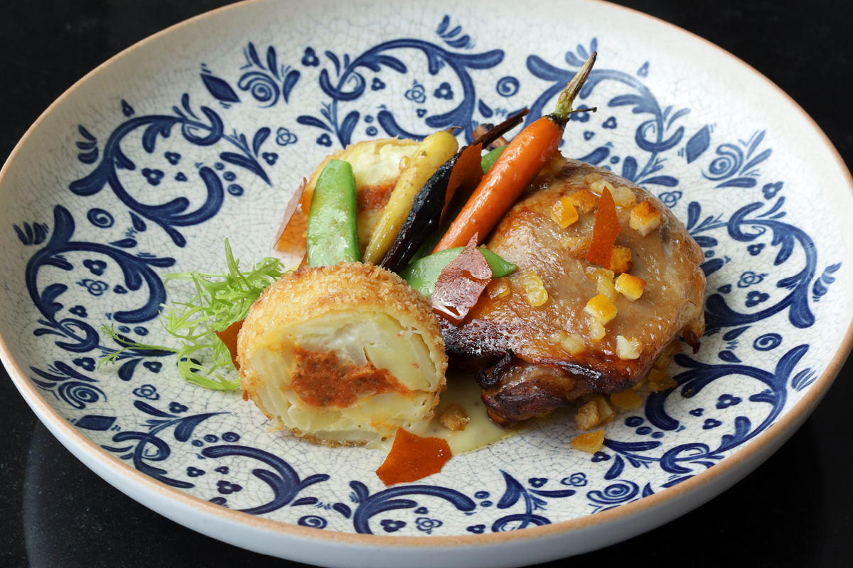 NOGA Z KACZKI Z CHIPSEM Z MARCHWI, GRATINĄ ZIEMNIACZANĄ I MUSEM Z JABŁEK I POMARAŃCZY