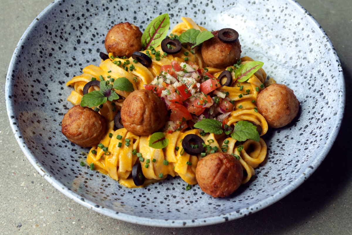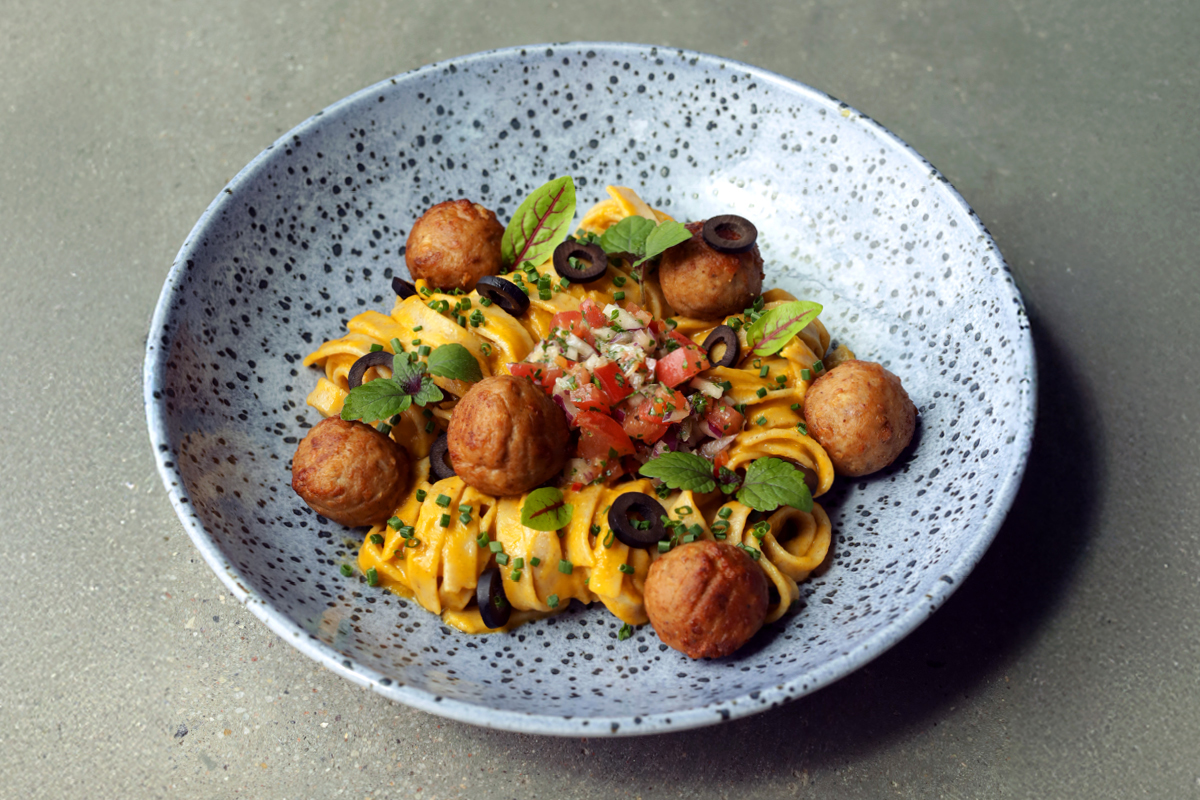 ORKISZOWE TAGLIATELLE Z SOSEM Z PIECZONYCH WARZYW, KLOPSIKAMI ROŚLINNYMI I SALSĄ POMIDOROWĄ