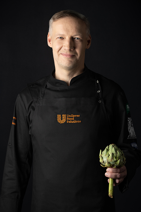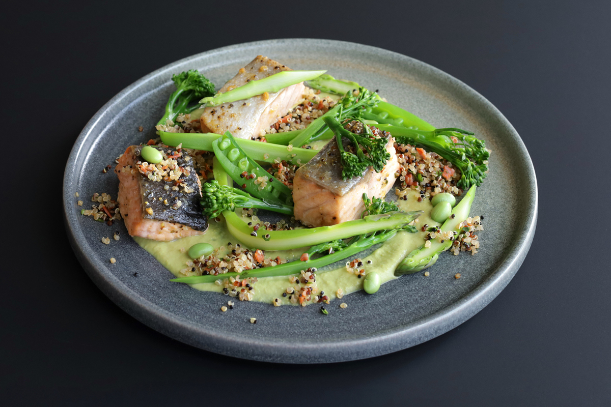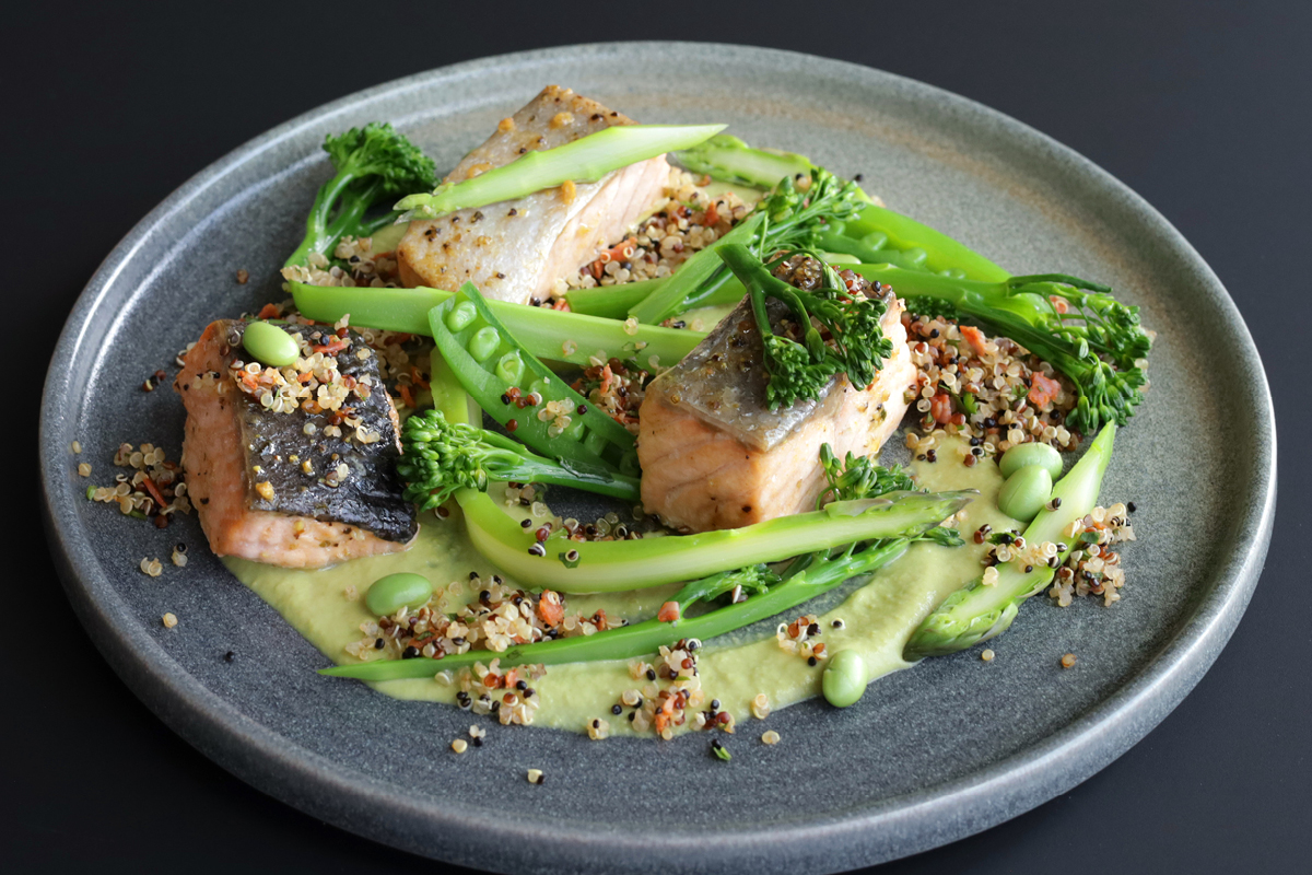 Ułóż danie na talerzu według własnej konwencji lub zainspiruj się naszym platingiem. Łososia podawaj na groszkowym sosie z kolorową komosą z chorizo oraz zielonymi warzywami.