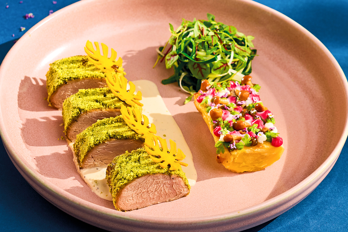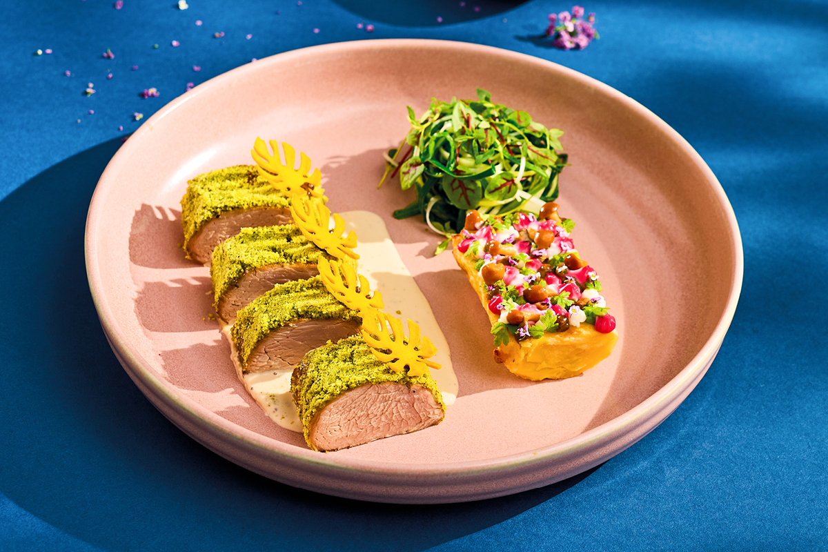 POLĘDWICZKA WOLNO GOTOWANA Z GRATIN, KOLOROWYM MAJONEZEM I SOSEM SEROWO-PIEPRZOWYM