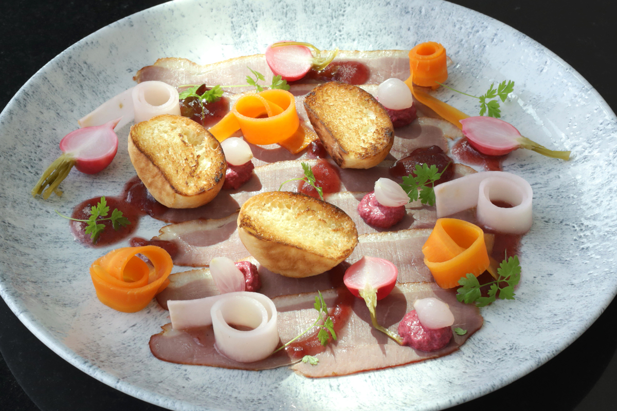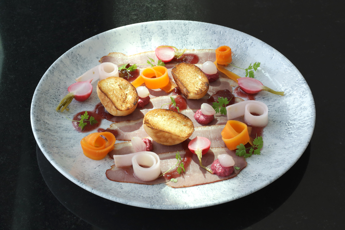 Ułóż danie na talerzu według własnej konwencji lub zainspiruj się naszym platingiem. Plasterki kaczki ułóż na talerzu. Majonez przełóż do plastikowego dyspensera i wyporcjuj kilka kulek na kaczce. Łyżką wyporcjuj sos śliwkowy. Dodaj piklowane warzywa i obsmażoną briochę. Udekoruj trybulą lub innymi mikroliśćmi.
