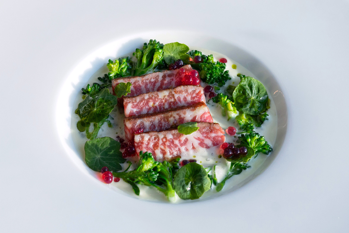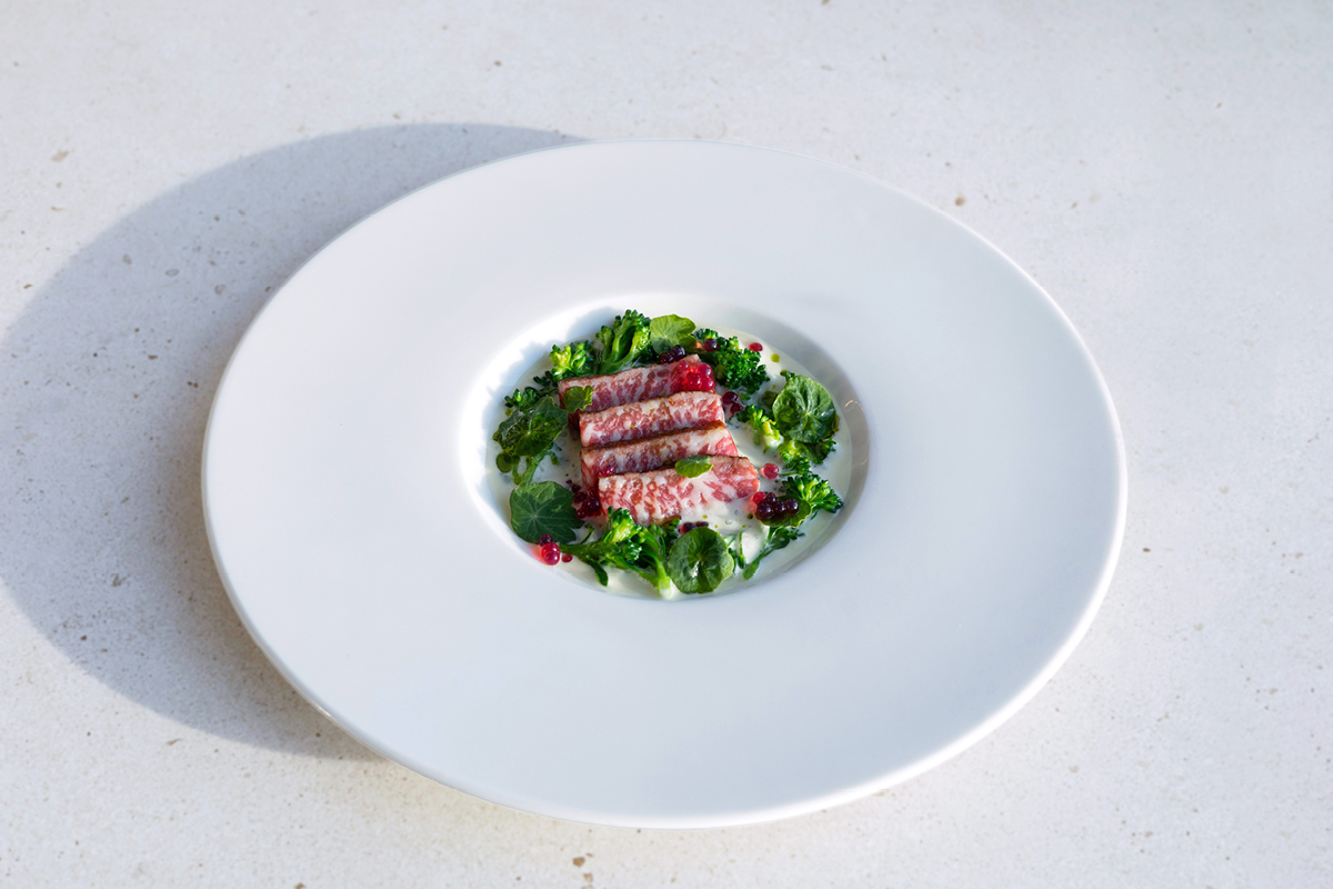 ROSTBEF WAGYŪ Z ESPUMĄ Z ZIEMNIAKA, BROKUŁAMI BIMI I EMULSJĄ POMIDOROWĄ
