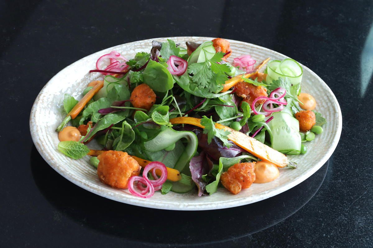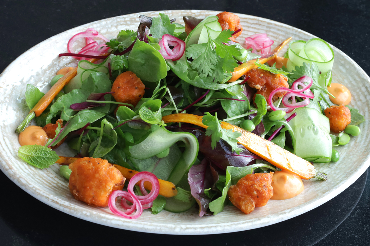 SAŁATA Z PANIEROWANYM KALAFIOREM, WIOSENNYMI WARZYWAMI, EDAMAME, SOSEM MAYO SRIRACHA I DRESSINGIEM CYTRUSOWYM