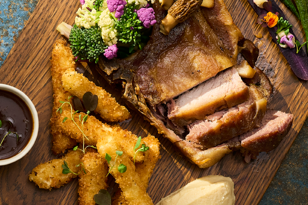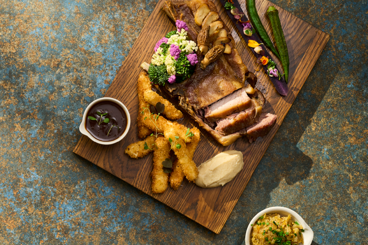 STEK DUROC Z PURÉE Z SELERA I SZAREJ RENETY, FRYTKAMI Z SELERA ORAZ SOSEM DEMI-GLACE Z POWIDŁAMI