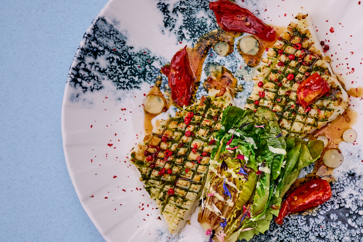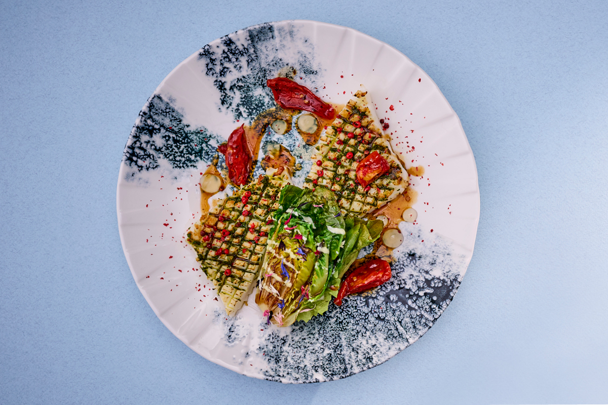 STEK Z KAŁAMARNICY HUMBOLDTA Z CHIMICHURRI, GRILLOWANĄ SAŁATĄ RZYMSKĄ, ALGAMI NORI W TEMPURZE I ŻELEM Z LIMONKI