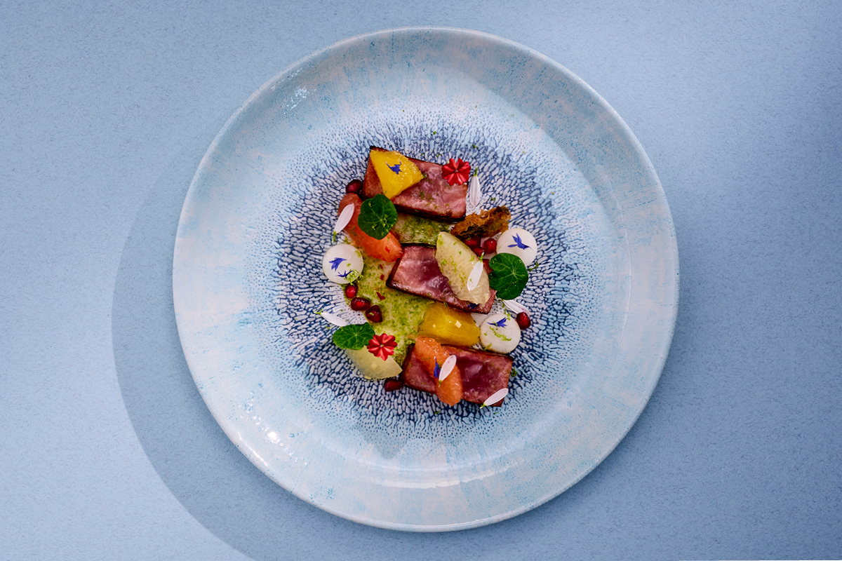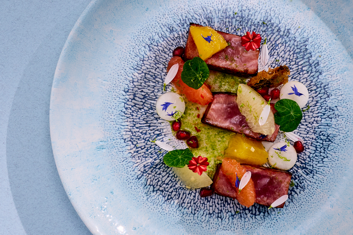 Ułóż danie na talerzu według własnej koncepcji lub zainspiruj się naszym platingiem. Udekoruj pestkami granatu, mikroliśćmi nasturcji, drobnymi kwiatami świeżymi oraz mieszanką kwiatów alpejskich Wiberg, podlej zielonym olejem.