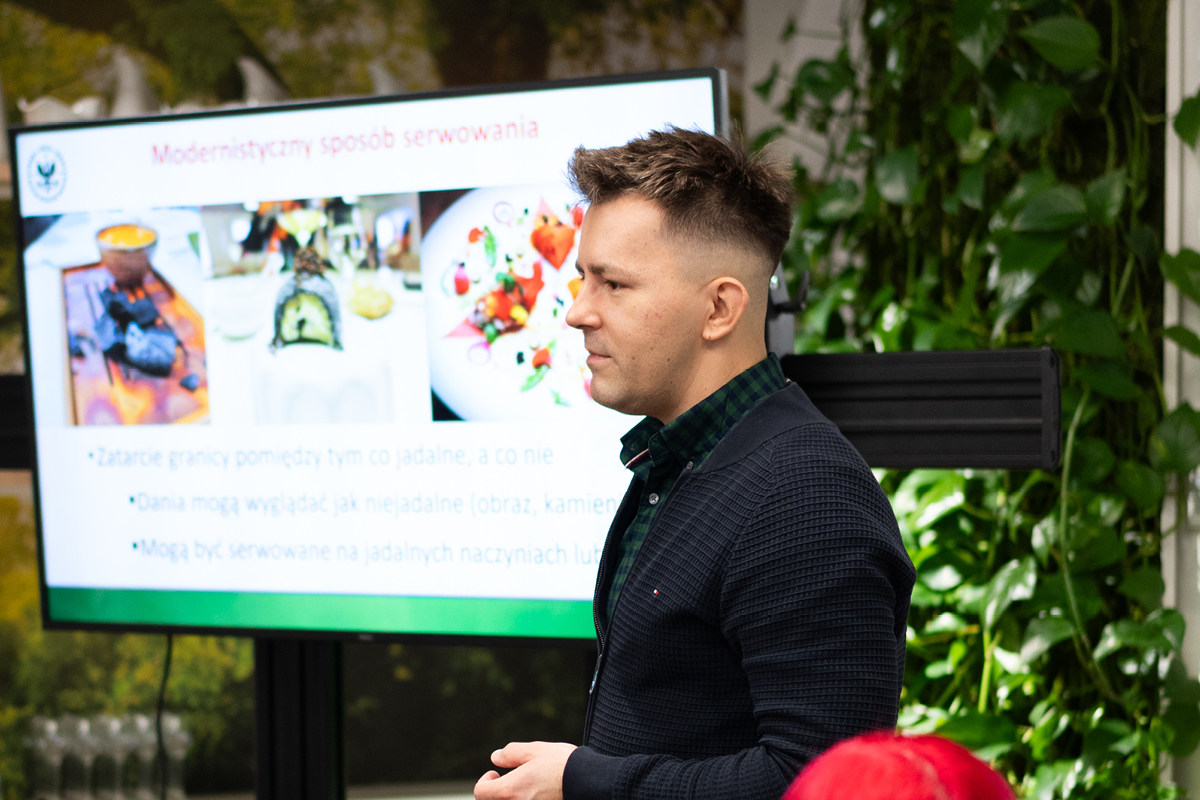 Dzień uzupełnił warsztat ekspercki z platingu, który poprowadził Artur Głuchowski – naukowiec i nauczyciel akademicki z SGGW, a także Patron Honorowy Akademii. Studenci zgłębiali tajniki estetyki talerza, proporcji i świadomego budowania kompozycji, ucząc się, że piękny talerz to integralna część kulinarnego doświadczenia.