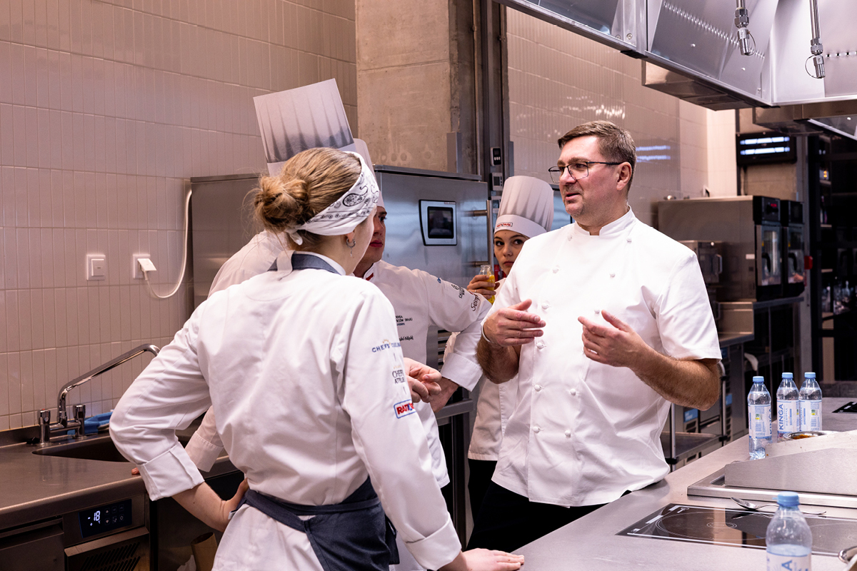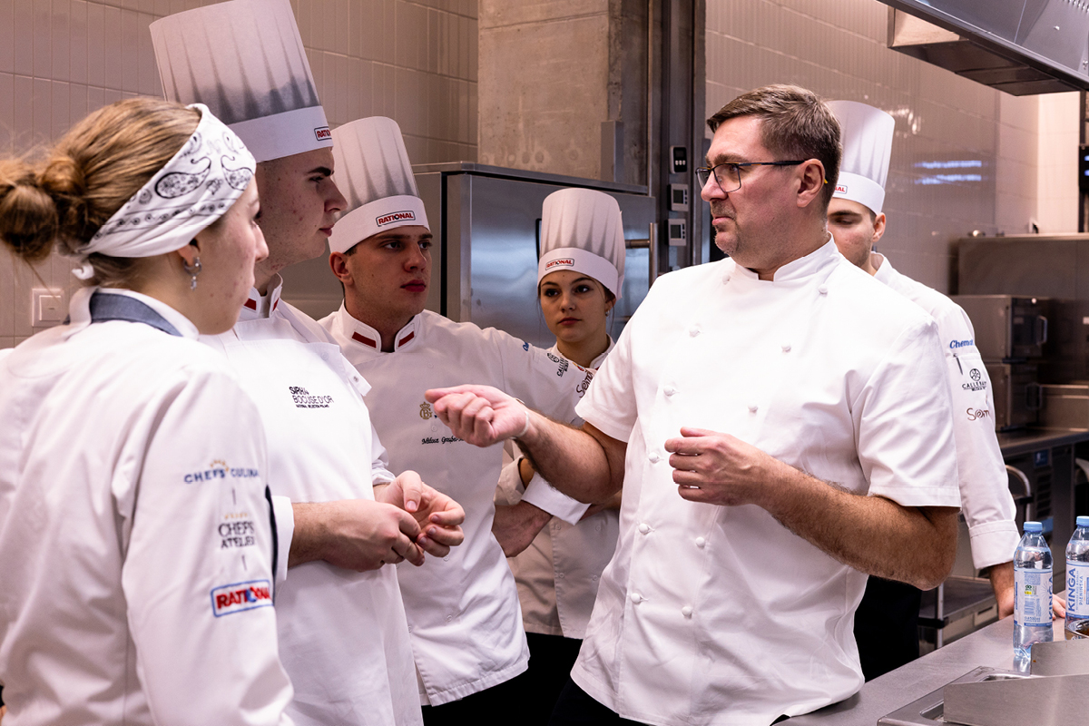Drugą część spotkania wypełnił warsztat kulinarny inspirowany sztandarowymi daniami kulinarnej legendy, Gordona Ramsaya. Poprowadził go Bob Mazur, szef kuchni stojący za jedną z najlepszych restauracji w Londynie i partner projektu YOXMAN – Michelin Star Chefs Dining. Studenci mieli okazję pod jego okiem pracować nad klasykami brytyjskiego szefa kuchni, poznając technikę, organizację pracy oraz standardy charakterystyczne dla restauracji najwyższej klasy.