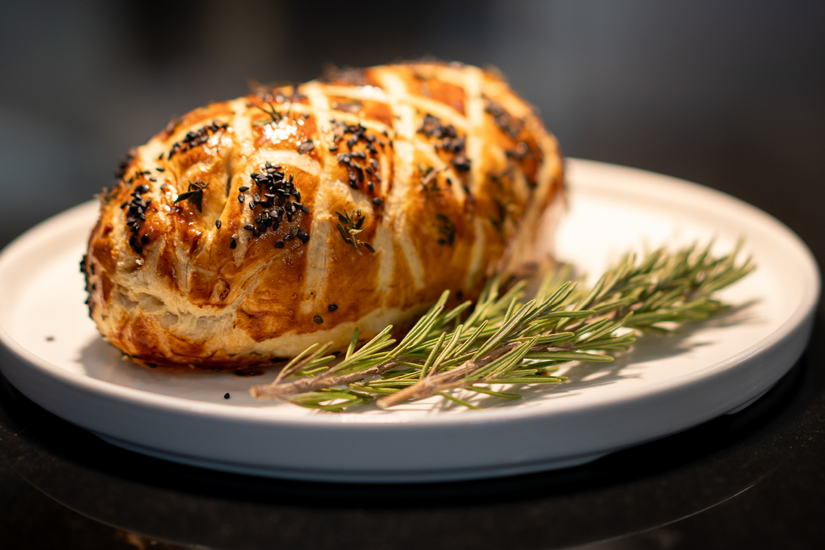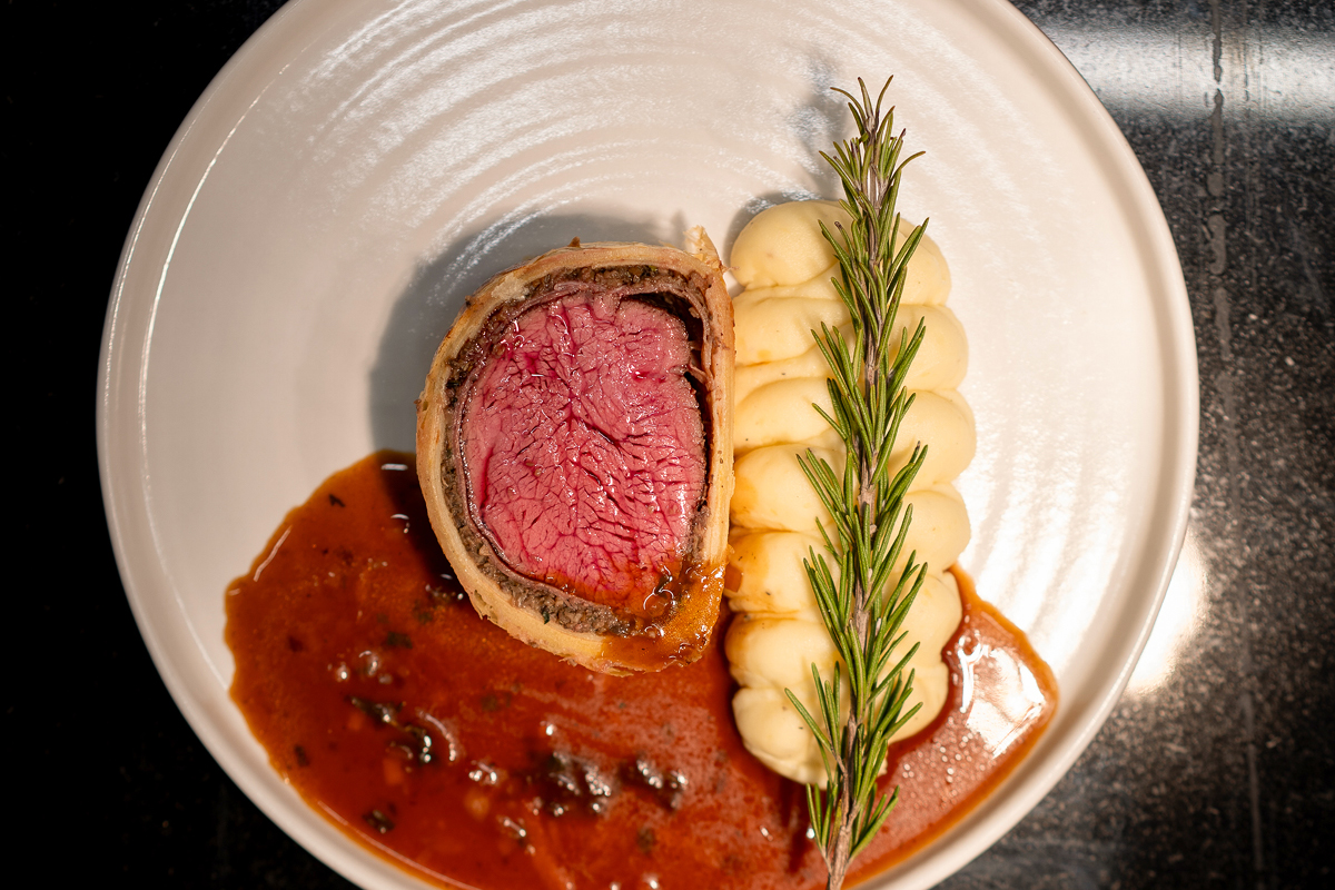 - polędwica Wellington z ziemniakami champ, wolno duszoną marchewką i sosem madeira z tymiankiem,